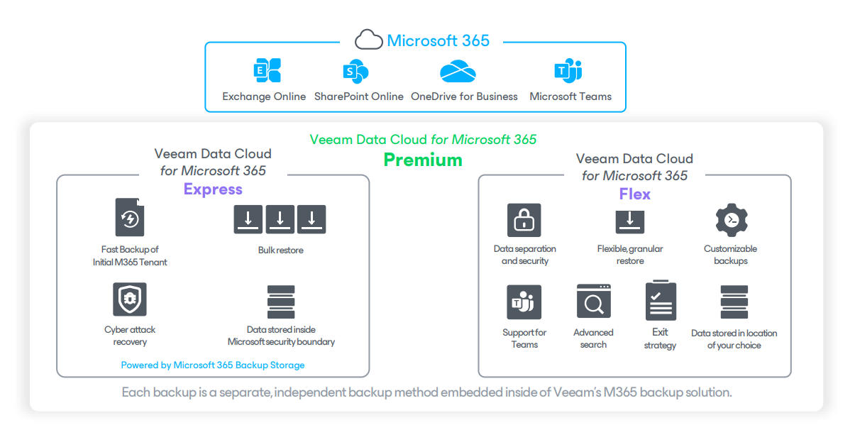 Microsoft’s backup solution is embedded inside Veeam Data Cloud for Microsoft 365, empowering organizations to quickly and confidently bounce back from any Microsoft 365 cyberattack or data loss scenario. It can be utilized as part of Veeam’s Express and Premium plans. Veeam’s plans consist of: