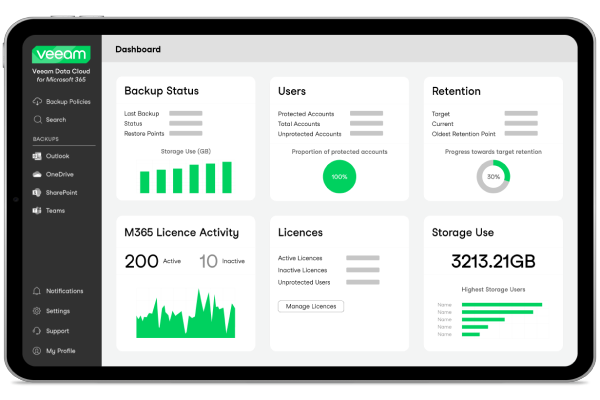 Veeam Data Cloud can back up all your data stored in your Microsoft 365 account, including SharePoint Online, Exchange Online, OneDrive for Business and Microsoft Teams data.